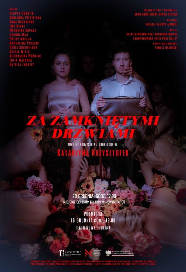 "Za zamkniętymi drzwiami" to spektakl, w którym bohaterowie ucieleśniają współczesną kondycję ludzką - przeglądamy się w nich niczym w czarnym lustrze. Do wypełnionego lękiem domu wkracza eksperymentalna, egzystencjalna terapeutka. Czy pomoże im odnaleźć własną esencję?