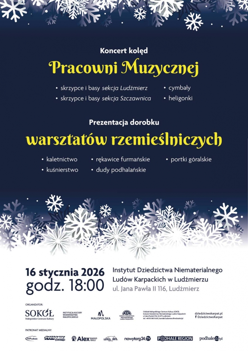 16 stycznia 2026 roku o godz. 18:00 w Ludźmierzu odbędzie się koncert kolęd w wykonaniu Pracowni Muzycznej oraz prezentacja dorobku warsztatów rzemieślniczych.