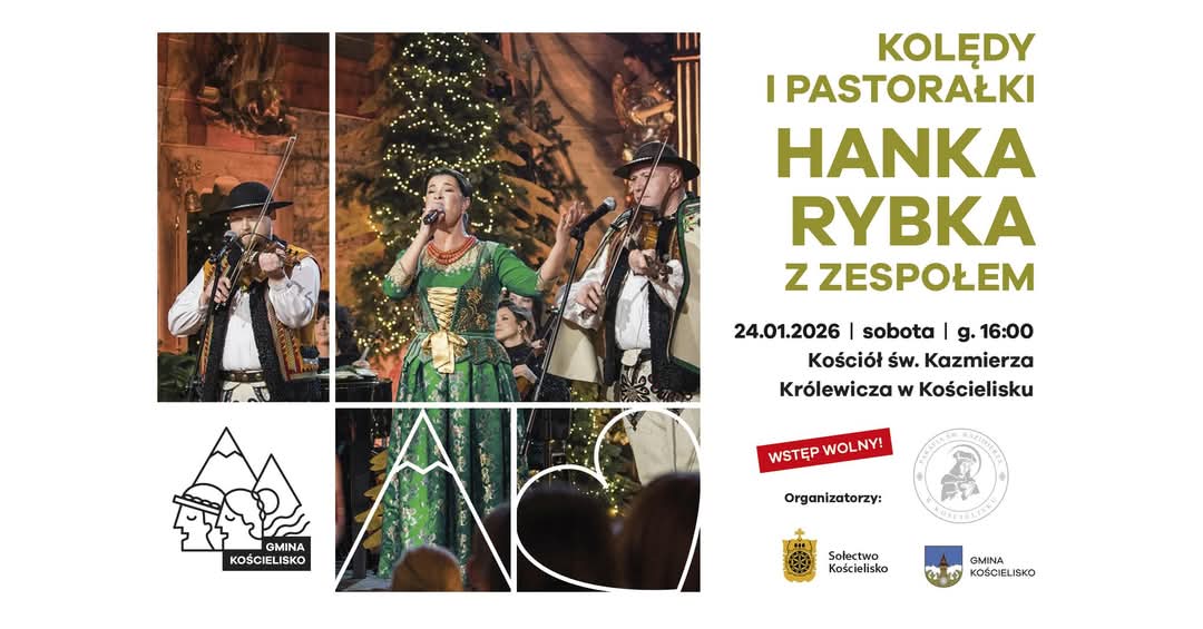 Gmina Kościelisko serdecznie zaprasza na koncert kolęd i pastorałek w wykonaniu jednej z najbardziej charyzmatycznych artystek Podhala - Hanki Rybki wraz z zespołem.