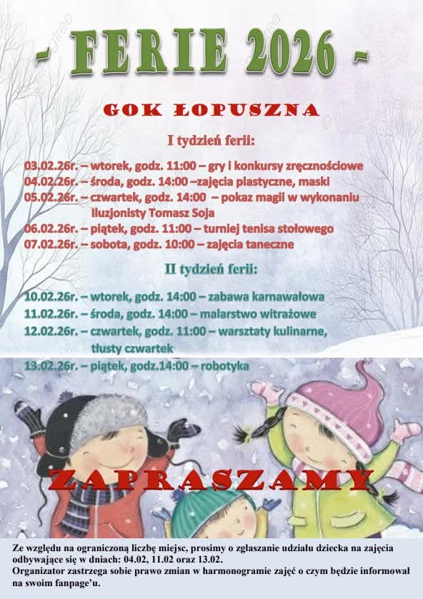 W programie m.in.: gry i konkursy, zajęcia plastyczne, pokaz magii, taniec, turniej tenisa stołowego, zabawa karnawałowa, warsztaty kulinarne oraz robotyka