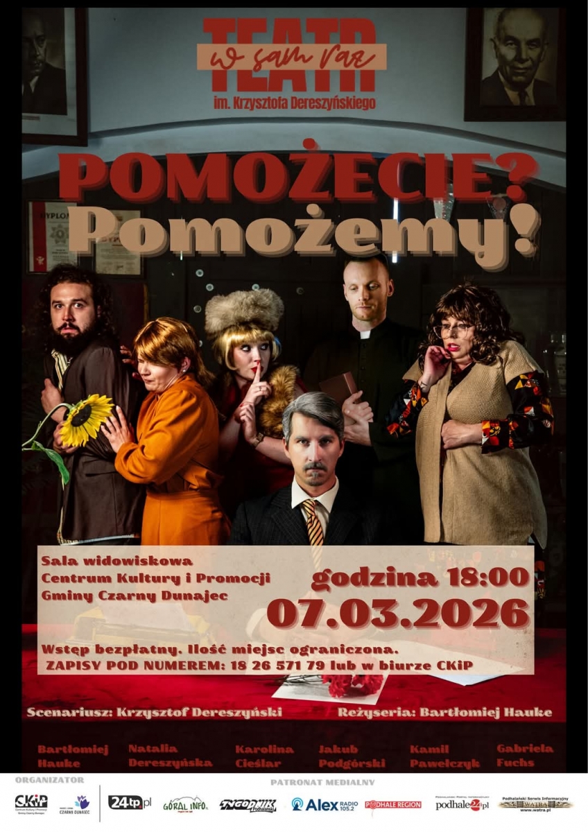 Dnia 7 marca 2026 o godzinie 18:00 na sali widowiskowej CKiP wystąpi Teatr w Sam Raz im. Krzysztofa Dereszyńskiego z programem kabaretowym "Pomożecie? Pomożemy!".