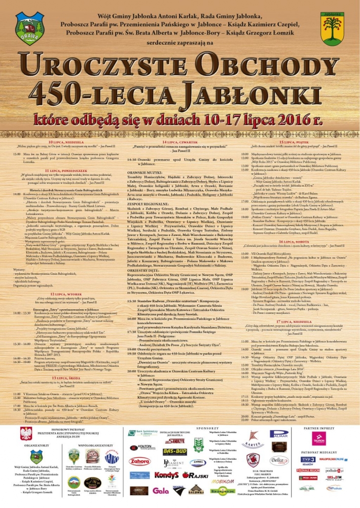 Program Uroczystych Obchodów 450-lecia Jabłonki - Jabłonka 10-17 lipca 2016r.