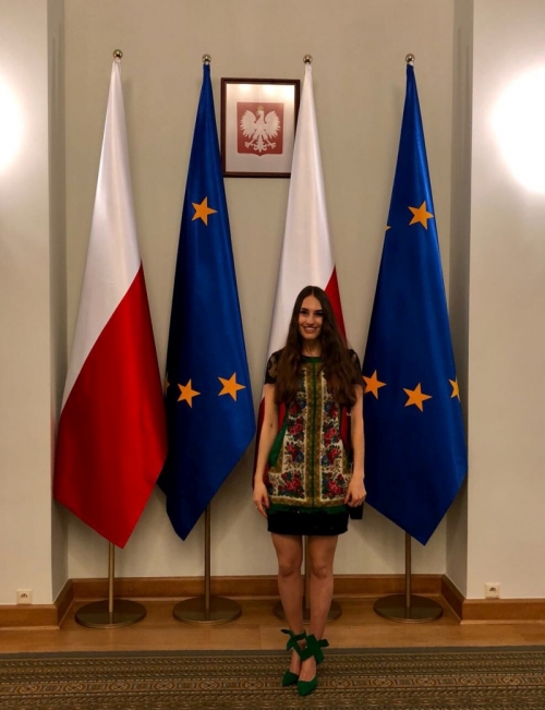 Nowotarżanka wystąpiła w Pałacu Prezydenckim w nowoczesnej regionalnej kreacji góralskiej, mającej przypominać, iż pochodzi właśnie ze stolicy Podhala Nowego Targu, stworzonej przez Folk Design Anety Larysy Knap.