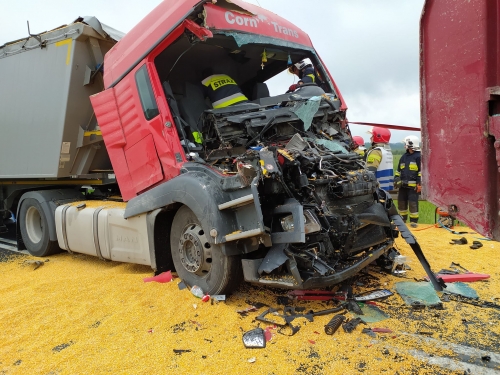 Siła uderzenie musiała być duża, gdyż ciężarówka, która najechała na naczepę, jest mocno zniszczona. W wyniku uderzenia w środku został zakleszczony kierowca. Z pomocą ruszyli mu strażacy. Na miejscu pracuje straż pożarna, policja i pogotowie ratunkowe.