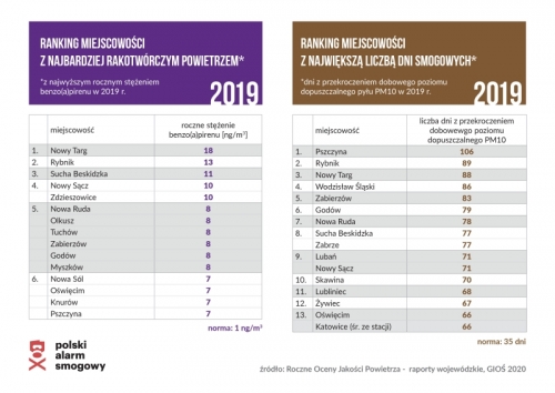 Ranking przedstawia miasta o najwyższym zanieczyszczeniu powietrza pod względem stężenia rakotwórczego benzo(a)pirenu oraz liczby dni, w których dobowe stężenie pyłu PM10 było powyżej normy. Z listy smogowych rekordzistów wypadł Kraków, w którym od września 2019 r. obowiązuje całkowity zakaz spalania węgla i drewna w gospodarstwach domowych.