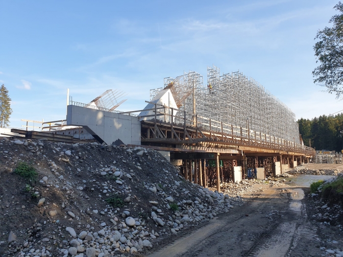 Jak informuje wójt gminy Łapsze Niżne Jakub Jamroz, przęsło mostu zostało kilka tygodni temu zazbrojone i zabetonowane, a obecnie trwa montaż tzw. "strun" do tulei, a następnie ich naprężenie - jest to jeden z elementów ustroju nośnego mostu. Montowane są również rusztowania, które posłużą do podparcia szalunków, aby wykonać łuki ustroju nośnego.