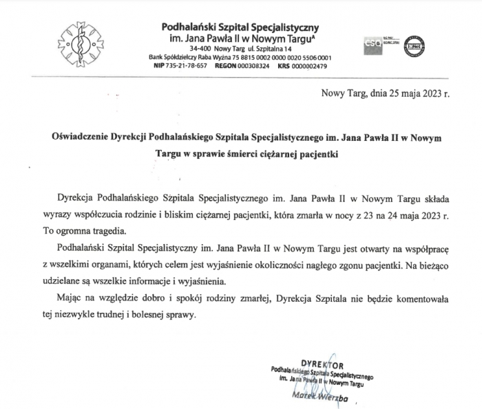 W piśmie przekazanym naszej redakcji czytamy m.in.: "Podhalański Szpital Specjalistyczny im. Jana Pawła II w Nowym Targu jest otwarty na współpracę ze wszelkimi organami, których celem jest wyjaśnienie okoliczności nagłego zgonu pacjentki. Na bieżąco udzielane są wszelkie informacje i wyjaśnienia. Mają na względzie dobro i spokój rodziny zmarłej, dyrekcja szpitala nie będzie komentowała tej niezwykle trudnej i bolesnej sprawy".