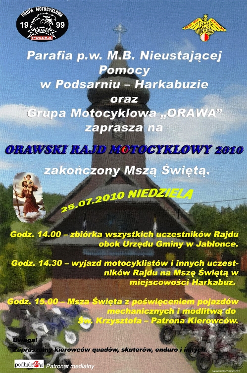 Rajd rozpocznie się o godz. 14 zbiórką uczestników na placu pod Urzędem Gminy w Jabłonce. Pół godziny później ruszy do Harkabuza, gdzie o godz. 15 odprawiona zostanie msza święta połączona z poświęceniem pojazdów i modlitwą do patrona kierowców - św. Krzysztofa. Nabożeństwo odprawi ksiądz Leszek Uroda, członek grupy "Orawa".