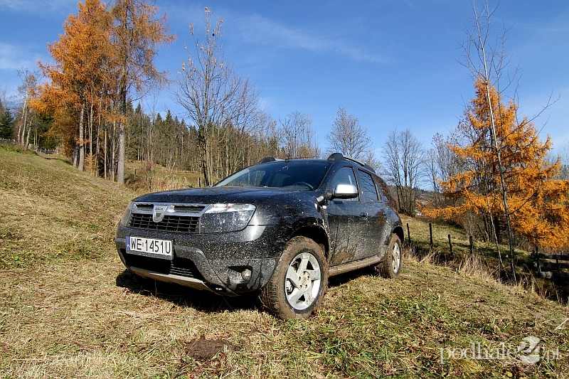Ze względu na opony wjeżdżaliśmy w teren pełni obaw. Nie w każdej sytuacji można poradzić sobie na "wielosezonówkach". Na początek Duster na piątkę z plusem zdał egzamin z ostrego podjazdu. Mimo sporego błota po wyłączeniu kontroli stabilności oraz włączeniu stałego napędu 4x4 uślizgi były minimalne i błyskawicznie niwelowane przez odpowiedni rozdział napędu. Następnie przyszedł czas na jazdę po płaskim, ale nadal trudnym terenie. Nie było żadnych problemów z dużymi nierównościami czy uskokami, z głębokimi kałużami, a także ze stromymi skarpami wymuszającymi boczny przechył. Jedyna sytuacja, w której Dacia zmuszona była się poddać, to głębokie koleiny, których nie dało się pokonać „tradycyjnie” ze względu na niezbyt wysoki prześwit, a próby przejechania nad koleiną utrudniają kiepskie opony. Te właśnie opony wywołały niebezpieczną sytuację także przy zjeździe, kiedy to samochód ześlizgiwał się w dół. Jednak dzięki bezpośredniemu układowi kierowniczemu oraz odpowiedniemu do terenu zawieszeniu udało się ustawić auto bokiem i wyhamować.