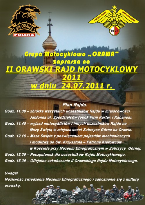 Na godz. 11.30 zaplanowana jest zbiórka wszystkich uczestników rajdu przy ul. Spółdzielców (obok firm Kartex i Kabanos). Kwadrans później jest wyjazd na mszę świętą do Zubrzycy Górnej - nabożeństwo rozpocznie się o godz. 12.15 przy kościele przy Muzeum Etnograficznym. Po mszy poczęstunek i zakończenie rajdu.