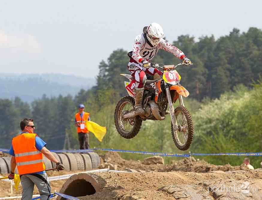 Krzysztof Łabuda z Lasku, który w motocrossie w klasie junior stawał już na podium eliminacji mistrzostw Polski, długo się rozkręcał. Kibice, zapewne koledzy, czekali kiedy na skoczni wykona skok. Doczekali się. Jego skoki były imponujące, ale do mety pierwszego finału dojechał na piątej pozycji. W drugim biegu poszło mu gorzej, był ósmy i ostatecznie sklasyfikowany został na szóstym miejscu.