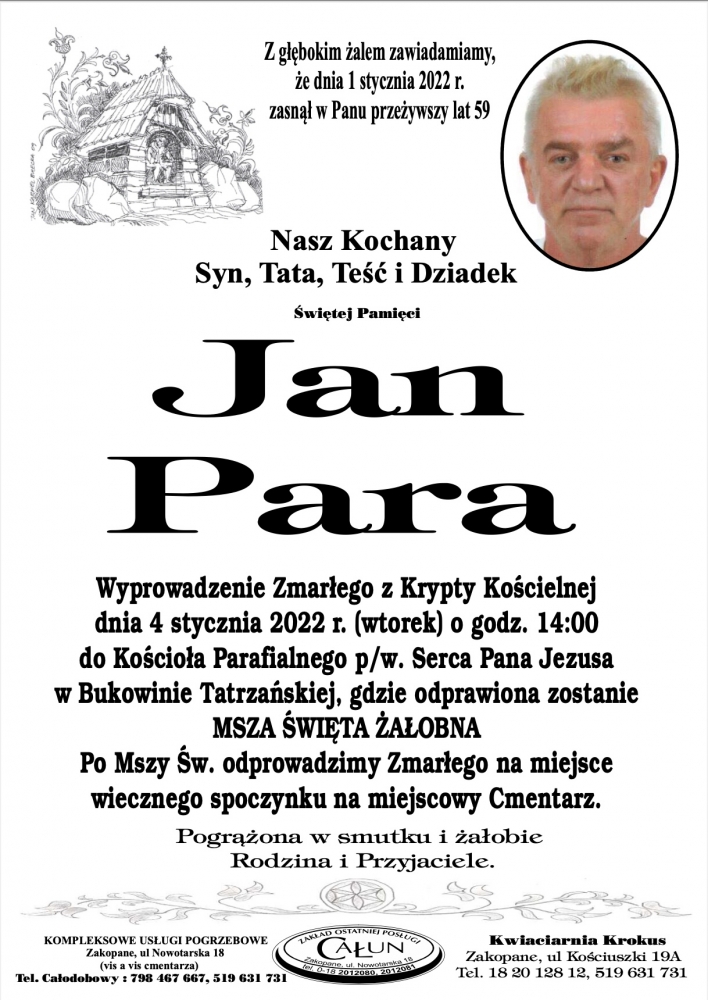Podhale24.pl zastrzega sobie prawo do nie publikowania wspomnień, w szczególności tych nie związanych z profilem działu nekrologi, zawierających wulgaryzmy, wzywających do zachowań niezgodnych z prawem, obrażających osoby publiczne i prywatne, obrażających inne narodowości, rasy, religie itd, oraz te, bez możliwości telefonicznej lub mailowej weryfikacji ich autora.