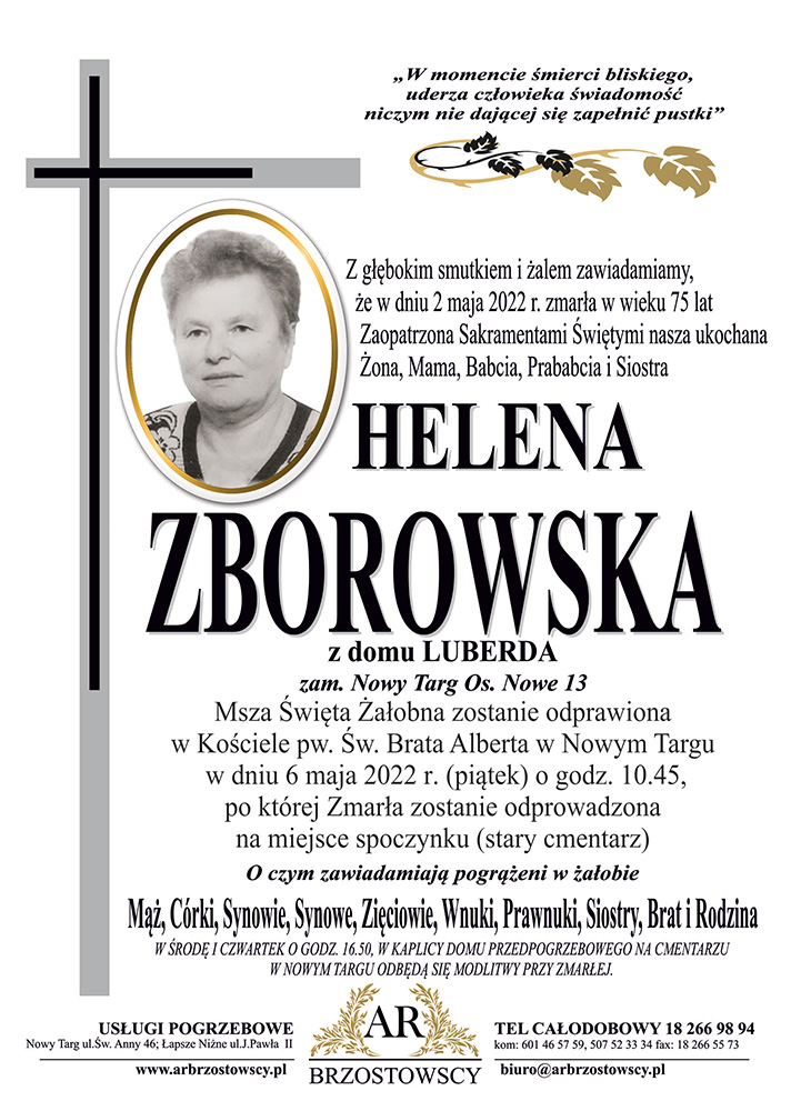 Podhale24.pl zastrzega sobie prawo do nie publikowania wspomnień, w szczególności tych nie związanych z profilem działu nekrologi, zawierających wulgaryzmy, wzywających do zachowań niezgodnych z prawem, obrażających osoby publiczne i prywatne, obrażających inne narodowości, rasy, religie itd, oraz te, bez możliwości telefonicznej lub mailowej weryfikacji ich autora.