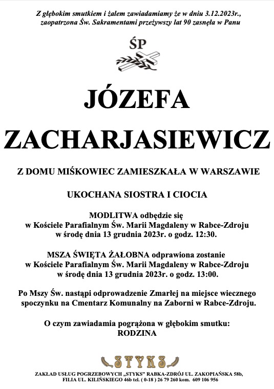 Józefa Zacharjasiewicz - Nekrologi - podhale24.pl