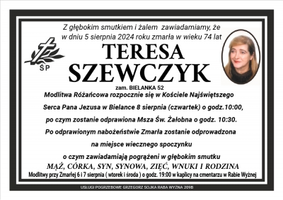 Podhale24.pl zastrzega sobie prawo do nie publikowania wspomnień, w szczególności tych nie związanych z profilem działu nekrologi, zawierających wulgaryzmy, wzywających do zachowań niezgodnych z prawem, obrażających osoby publiczne i prywatne, obrażających inne narodowości, rasy, religie itd, oraz te, bez możliwości telefonicznej lub mailowej weryfikacji ich autora.
