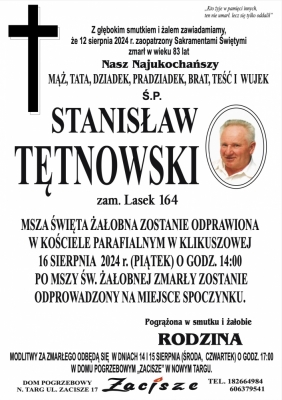 Podhale24.pl zastrzega sobie prawo do nie publikowania wspomnień, w szczególności tych nie związanych z profilem działu nekrologi, zawierających wulgaryzmy, wzywających do zachowań niezgodnych z prawem, obrażających osoby publiczne i prywatne, obrażających inne narodowości, rasy, religie itd, oraz te, bez możliwości telefonicznej lub mailowej weryfikacji ich autora.