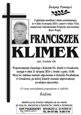 Podhale24.pl zastrzega sobie prawo do nie publikowania wspomnień, w szczególności tych nie związanych z profilem działu nekrologi, zawierających wulgaryzmy, wzywających do zachowań niezgodnych z prawem, obrażających osoby publiczne i prywatne, obrażających inne narodowości, rasy, religie itd, oraz te, bez możliwości telefonicznej lub mailowej weryfikacji ich autora.