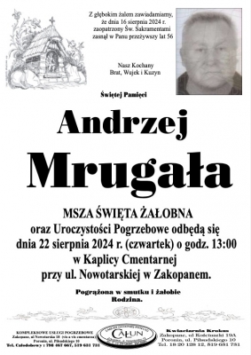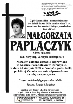 Podhale24.pl zastrzega sobie prawo do nie publikowania wspomnień, w szczególności tych nie związanych z profilem działu nekrologi, zawierających wulgaryzmy, wzywających do zachowań niezgodnych z prawem, obrażających osoby publiczne i prywatne, obrażających inne narodowości, rasy, religie itd, oraz te, bez możliwości telefonicznej lub mailowej weryfikacji ich autora.