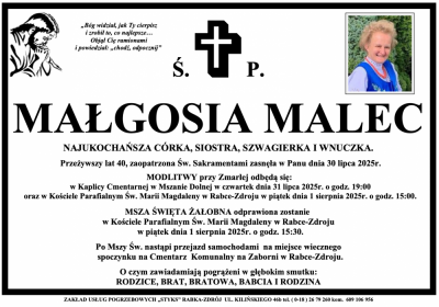 Podhale24.pl zastrzega sobie prawo do nie publikowania wspomnień, w szczególności tych nie związanych z profilem działu nekrologi, zawierających wulgaryzmy, wzywających do zachowań niezgodnych z prawem, obrażających osoby publiczne i prywatne, obrażających inne narodowości, rasy, religie itd, oraz te, bez możliwości telefonicznej lub mailowej weryfikacji ich autora.
