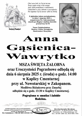 Podhale24.pl zastrzega sobie prawo do nie publikowania wspomnień, w szczególności tych nie związanych z profilem działu nekrologi, zawierających wulgaryzmy, wzywających do zachowań niezgodnych z prawem, obrażających osoby publiczne i prywatne, obrażających inne narodowości, rasy, religie itd, oraz te, bez możliwości telefonicznej lub mailowej weryfikacji ich autora.