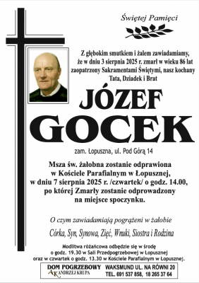 Podhale24.pl zastrzega sobie prawo do nie publikowania wspomnień, w szczególności tych nie związanych z profilem działu nekrologi, zawierających wulgaryzmy, wzywających do zachowań niezgodnych z prawem, obrażających osoby publiczne i prywatne, obrażających inne narodowości, rasy, religie itd, oraz te, bez możliwości telefonicznej lub mailowej weryfikacji ich autora.