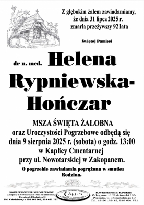 Podhale24.pl zastrzega sobie prawo do nie publikowania wspomnień, w szczególności tych nie związanych z profilem działu nekrologi, zawierających wulgaryzmy, wzywających do zachowań niezgodnych z prawem, obrażających osoby publiczne i prywatne, obrażających inne narodowości, rasy, religie itd, oraz te, bez możliwości telefonicznej lub mailowej weryfikacji ich autora.
