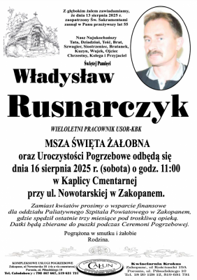 Podhale24.pl zastrzega sobie prawo do nie publikowania wspomnień, w szczególności tych nie związanych z profilem działu nekrologi, zawierających wulgaryzmy, wzywających do zachowań niezgodnych z prawem, obrażających osoby publiczne i prywatne, obrażających inne narodowości, rasy, religie itd, oraz te, bez możliwości telefonicznej lub mailowej weryfikacji ich autora.