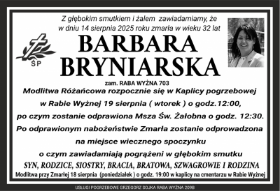 Podhale24.pl zastrzega sobie prawo do nie publikowania wspomnień, w szczególności tych nie związanych z profilem działu nekrologi, zawierających wulgaryzmy, wzywających do zachowań niezgodnych z prawem, obrażających osoby publiczne i prywatne, obrażających inne narodowości, rasy, religie itd, oraz te, bez możliwości telefonicznej lub mailowej weryfikacji ich autora.