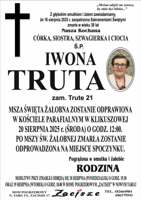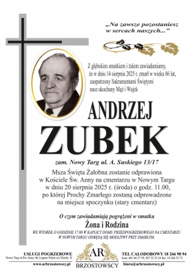 Podhale24.pl zastrzega sobie prawo do nie publikowania wspomnień, w szczególności tych nie związanych z profilem działu nekrologi, zawierających wulgaryzmy, wzywających do zachowań niezgodnych z prawem, obrażających osoby publiczne i prywatne, obrażających inne narodowości, rasy, religie itd, oraz te, bez możliwości telefonicznej lub mailowej weryfikacji ich autora.