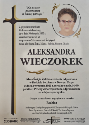 Podhale24.pl zastrzega sobie prawo do nie publikowania wspomnień, w szczególności tych nie związanych z profilem działu nekrologi, zawierających wulgaryzmy, wzywających do zachowań niezgodnych z prawem, obrażających osoby publiczne i prywatne, obrażających inne narodowości, rasy, religie itd, oraz te, bez możliwości telefonicznej lub mailowej weryfikacji ich autora.