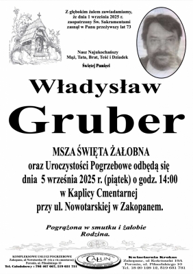 Podhale24.pl zastrzega sobie prawo do nie publikowania wspomnień, w szczególności tych nie związanych z profilem działu nekrologi, zawierających wulgaryzmy, wzywających do zachowań niezgodnych z prawem, obrażających osoby publiczne i prywatne, obrażających inne narodowości, rasy, religie itd, oraz te, bez możliwości telefonicznej lub mailowej weryfikacji ich autora.