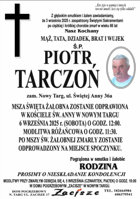 Podhale24.pl zastrzega sobie prawo do nie publikowania wspomnień, w szczególności tych nie związanych z profilem działu nekrologi, zawierających wulgaryzmy, wzywających do zachowań niezgodnych z prawem, obrażających osoby publiczne i prywatne, obrażających inne narodowości, rasy, religie itd, oraz te, bez możliwości telefonicznej lub mailowej weryfikacji ich autora.