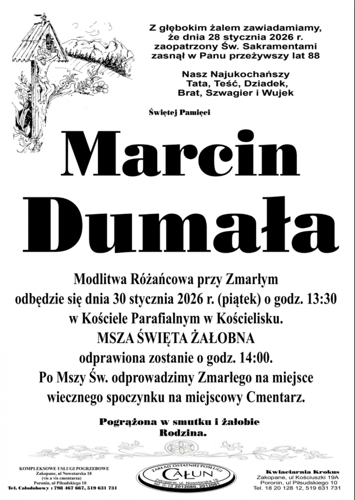 Podhale24.pl zastrzega sobie prawo do nie publikowania wspomnień, w szczególności tych nie związanych z profilem działu nekrologi, zawierających wulgaryzmy, wzywających do zachowań niezgodnych z prawem, obrażających osoby publiczne i prywatne, obrażających inne narodowości, rasy, religie itd, oraz te, bez możliwości telefonicznej lub mailowej weryfikacji ich autora.