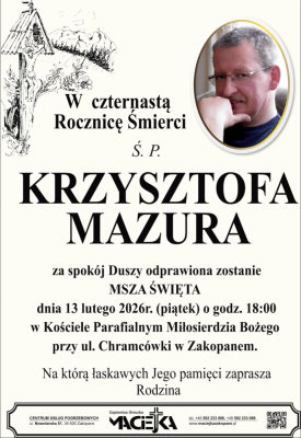 Podhale24.pl zastrzega sobie prawo do nie publikowania wspomnień, w szczególności tych nie związanych z profilem działu nekrologi, zawierających wulgaryzmy, wzywających do zachowań niezgodnych z prawem, obrażających osoby publiczne i prywatne, obrażających inne narodowości, rasy, religie itd, oraz te, bez możliwości telefonicznej lub mailowej weryfikacji ich autora.