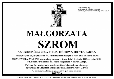 Podhale24.pl zastrzega sobie prawo do nie publikowania wspomnień, w szczególności tych nie związanych z profilem działu nekrologi, zawierających wulgaryzmy, wzywających do zachowań niezgodnych z prawem, obrażających osoby publiczne i prywatne, obrażających inne narodowości, rasy, religie itd, oraz te, bez możliwości telefonicznej lub mailowej weryfikacji ich autora.