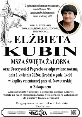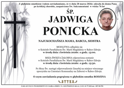 Podhale24.pl zastrzega sobie prawo do nie publikowania wspomnień, w szczególności tych nie związanych z profilem działu nekrologi, zawierających wulgaryzmy, wzywających do zachowań niezgodnych z prawem, obrażających osoby publiczne i prywatne, obrażających inne narodowości, rasy, religie itd, oraz te, bez możliwości telefonicznej lub mailowej weryfikacji ich autora.