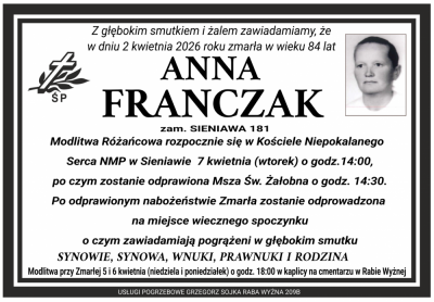 Podhale24.pl zastrzega sobie prawo do nie publikowania wspomnień, w szczególności tych nie związanych z profilem działu nekrologi, zawierających wulgaryzmy, wzywających do zachowań niezgodnych z prawem, obrażających osoby publiczne i prywatne, obrażających inne narodowości, rasy, religie itd, oraz te, bez możliwości telefonicznej lub mailowej weryfikacji ich autora.