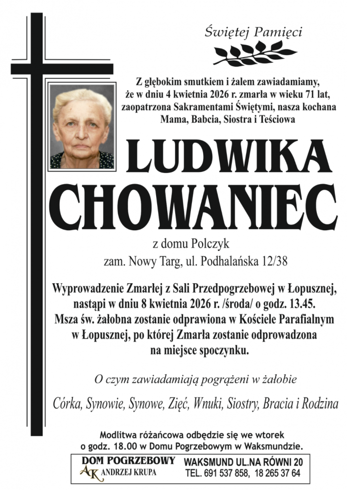 Ludwika Chowaniec - Nekrologi - podhale24.pl