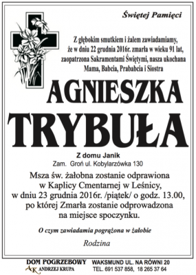 Podhale24.pl zastrzega sobie prawo do nie publikowania wspomnień, w szczególności tych nie związanych z profilem działu nekrologi, zawierających wulgaryzmy, wzywających do zachowań niezgodnych z prawem, obrażających osoby publiczne i prywatne, obrażających inne narodowości, rasy, religie itd, oraz te, bez możliwości telefonicznej lub mailowej weryfikacji ich autora.