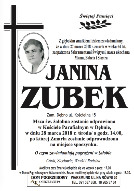 Podhale24.pl zastrzega sobie prawo do nie publikowania wspomnień, w szczególności tych nie związanych z profilem działu nekrologi, zawierających wulgaryzmy, wzywających do zachowań niezgodnych z prawem, obrażających osoby publiczne i prywatne, obrażających inne narodowości, rasy, religie itd, oraz te, bez możliwości telefonicznej lub mailowej weryfikacji ich autora.