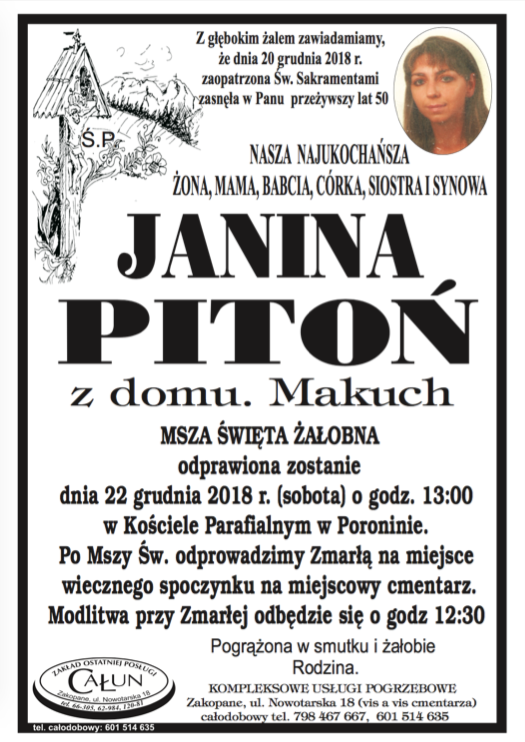 Podhale24.pl zastrzega sobie prawo do nie publikowania wspomnień, w szczególności tych nie związanych z profilem działu nekrologi, zawierających wulgaryzmy, wzywających do zachowań niezgodnych z prawem, obrażających osoby publiczne i prywatne, obrażających inne narodowości, rasy, religie itd, oraz te, bez możliwości telefonicznej lub mailowej weryfikacji ich autora.
