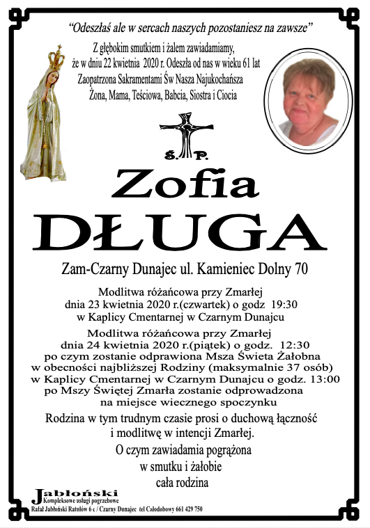 Podhale24.pl zastrzega sobie prawo do nie publikowania wspomnień, w szczególności tych nie związanych z profilem działu nekrologi, zawierających wulgaryzmy, wzywających do zachowań niezgodnych z prawem, obrażających osoby publiczne i prywatne, obrażających inne narodowości, rasy, religie itd, oraz te, bez możliwości telefonicznej lub mailowej weryfikacji ich autora.
