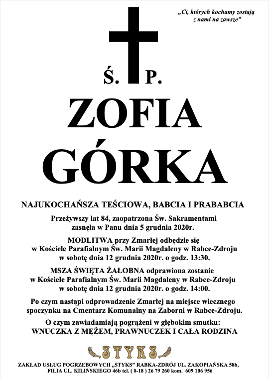 Podhale24.pl zastrzega sobie prawo do nie publikowania wspomnień, w szczególności tych nie związanych z profilem działu nekrologi, zawierających wulgaryzmy, wzywających do zachowań niezgodnych z prawem, obrażających osoby publiczne i prywatne, obrażających inne narodowości, rasy, religie itd, oraz te, bez możliwości telefonicznej lub mailowej weryfikacji ich autora.