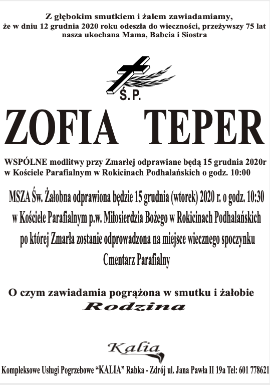Podhale24.pl zastrzega sobie prawo do nie publikowania wspomnień, w szczególności tych nie związanych z profilem działu nekrologi, zawierających wulgaryzmy, wzywających do zachowań niezgodnych z prawem, obrażających osoby publiczne i prywatne, obrażających inne narodowości, rasy, religie itd, oraz te, bez możliwości telefonicznej lub mailowej weryfikacji ich autora.