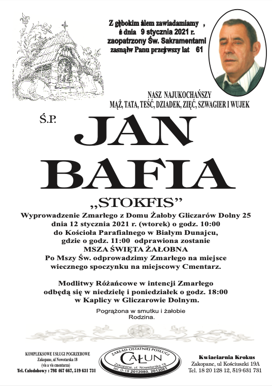 Podhale24.pl zastrzega sobie prawo do nie publikowania wspomnień, w szczególności tych nie związanych z profilem działu nekrologi, zawierających wulgaryzmy, wzywających do zachowań niezgodnych z prawem, obrażających osoby publiczne i prywatne, obrażających inne narodowości, rasy, religie itd, oraz te, bez możliwości telefonicznej lub mailowej weryfikacji ich autora.