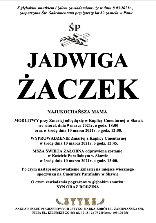 Jadwiga Żaczek - Nekrologi - podhale24.pl