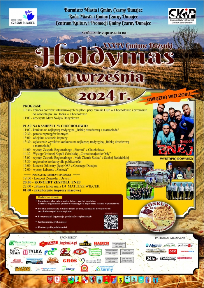 W niedzielę 1 września w Chochołowie zorganizowane zostaną XXXIV Gminne Dożynki- Hołdymas. Jedną z atrakcji będzie koncert zespołu Enej.
