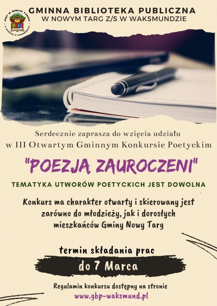 Tematyka utworów poetyckich jest dowolna. Konkurs ma charakter otwarty i skierowany jest zarówno do młodzieży, jak i dorosłych z gminy Nowy Targ.