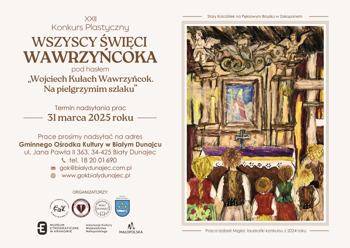 Już po raz dwudziesty drugi miłośnicy sztuki i tradycji góralskiej będą mieli okazję zaprezentować swoje talenty w Konkursie Plastycznym "Wszyscy Święci Wawrzyńcoka". Tegoroczna edycja, odbywająca się pod hasłem "Wojciech Kułach Wawrzyńcok. Na pielgrzymim szlaku", koncentruje się na wpływie pielgrzymki do Rzymu na twórczość wybitnego XIX-wiecznego rzeźbiarza ludowego. Organizatorzy zapraszają do udziału dzieci, młodzież i dorosłych. Termin nadsyłania prac mija 31 marca 2025 roku.