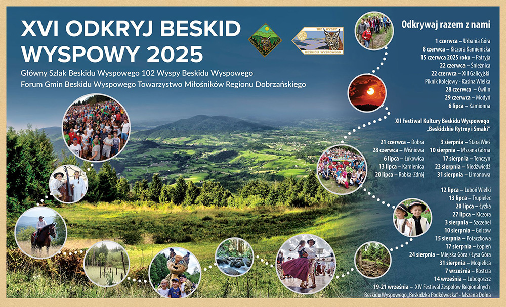 Forum Gmin Beskidu Wyspowego, Towarzystwo Miłośników Regionu Dobrzańskiego zaprasza po raz 16-ty na wspólne odkrywanie Beskidzkich Wysp. W tym roku akcja Odkryj Beskid Wyspowy zagości również na terenie Rabki-Zdroju dwukrotnie: 12 lipca uczestnicy cotygodniowych wędrówek wejdą nocą na Luboń Wielki, a 20 lipca w Amfiteatrze odbędzie się XII Festiwal Kultury Beskidu Wyspowego "Beskidzkie Rytmy i Smaki".